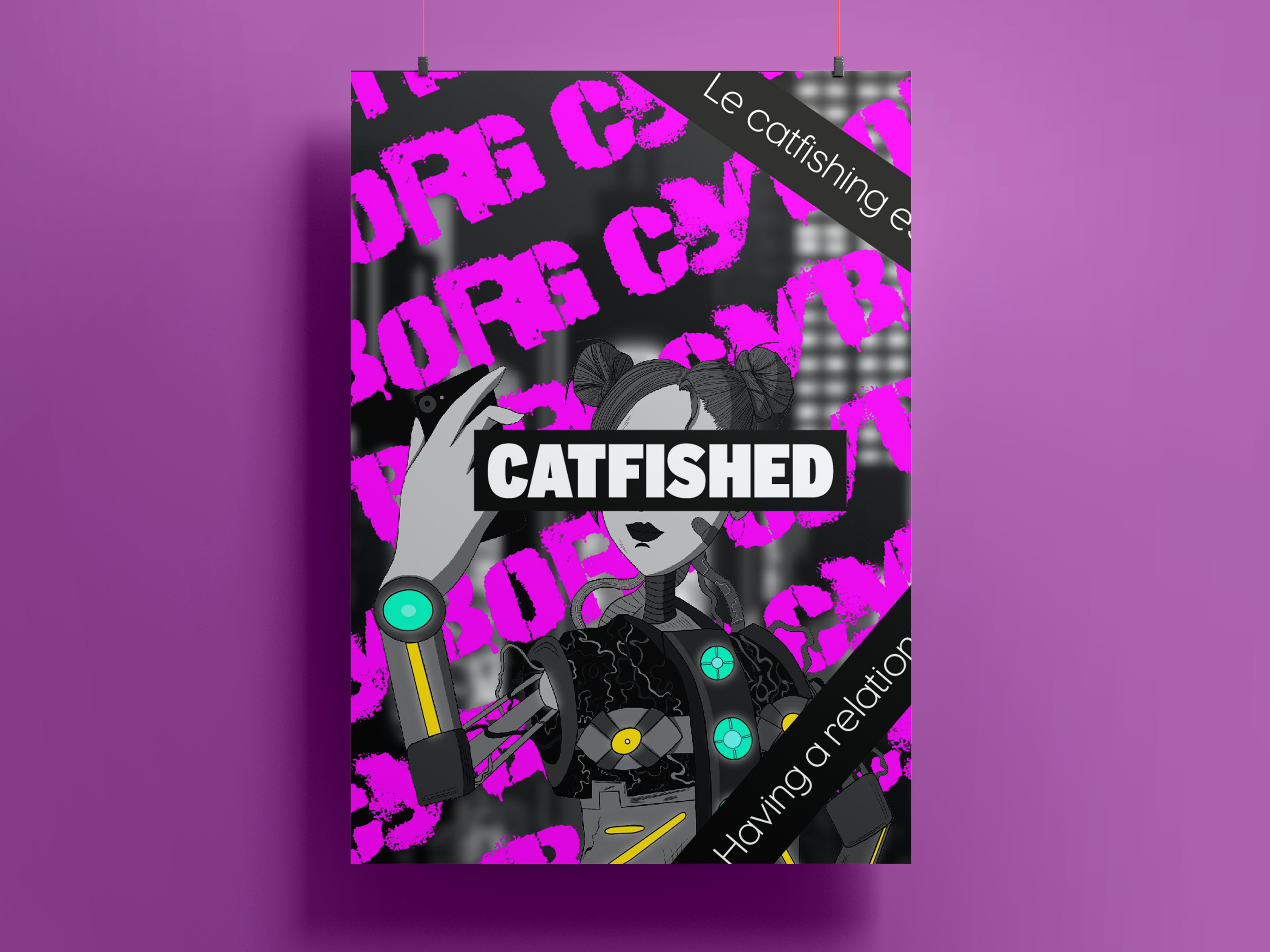 Deuxième partie: Ceci est le poster révélé grâce à la réalité augmentée, ici avec l'application Artivive. Le côté caché de la personne que l'on pensait humaine est ainsi montré, sous la forme d'une femme Cyborg avec le message "catfished" pour apppuyer le fait qu'on s'est fait avoir. Un message défilant correspondant à la définition du catfishing apparaît également.