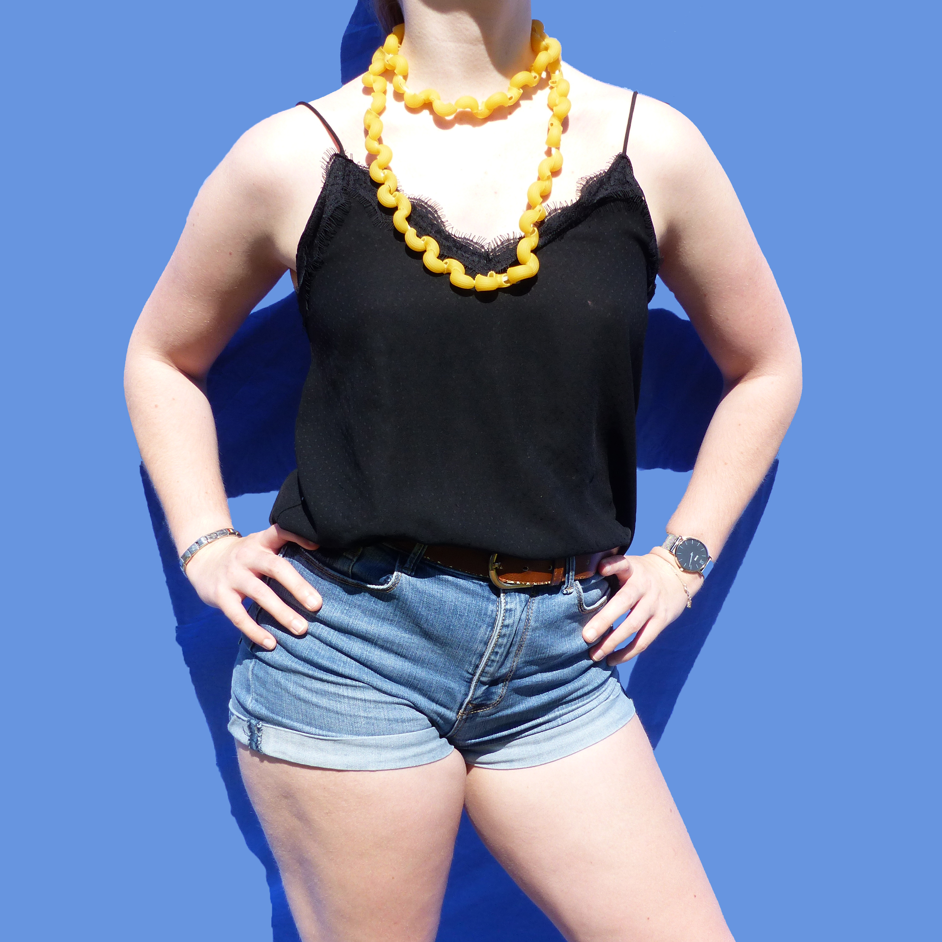 collier de pâtes lui, les plats qui reviennent souvent et le fait que les pâtes ont été très prisées dans les supermachés. Enfin, les gants de cuisine symbolisent le fait que j’ai mangé BEAUCOUP de gâteaux pendant ce confinement,