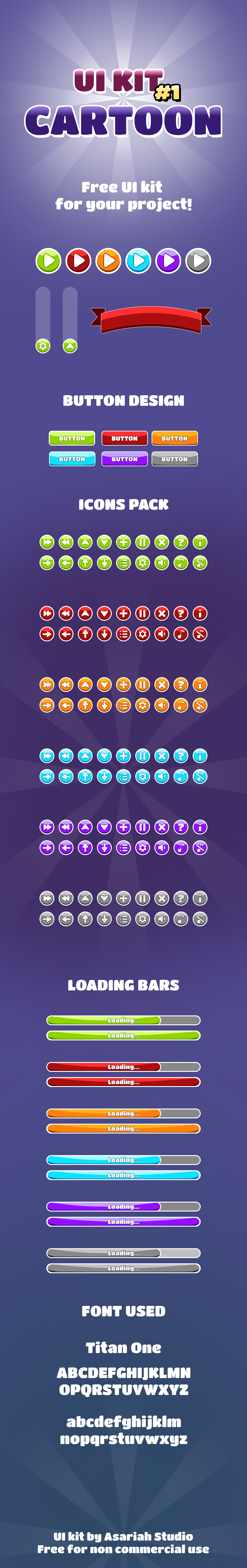 Kit UI (Interface utilisateur) inspiré de cartoons et de casual games, que je propose gratuitement à tout ceux voulant expérimenter de petits projets personnels de jeux-vidéos et/ou d'applications.